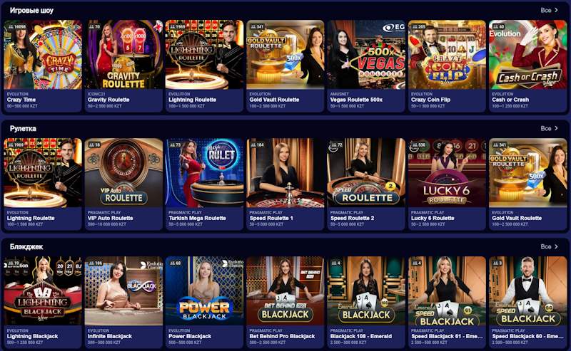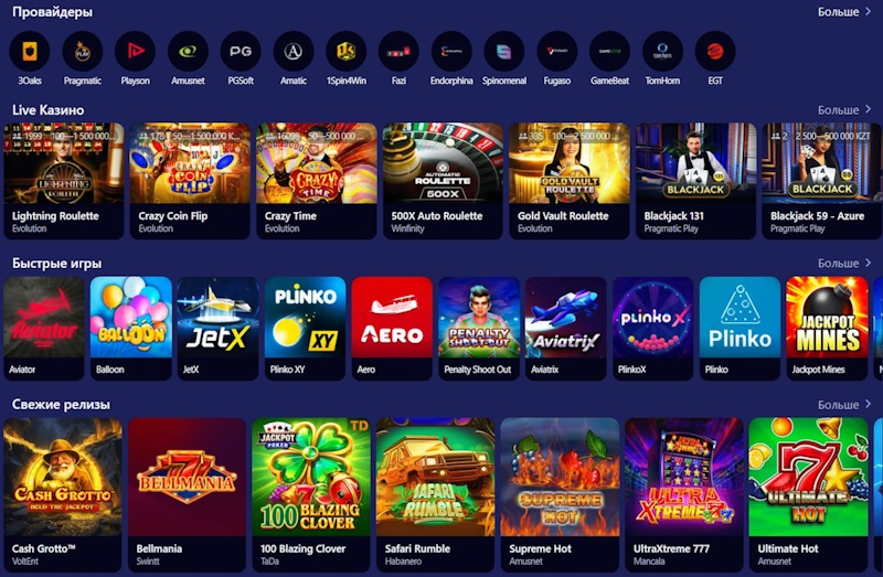 Игровой зал платформы насчитывает более 10 000 развлечений, среди которых свыше 8 500 слотов от 85 провайдеров. Здесь собраны как простые автоматы с классическими символами, так и сложные видеослоты с механиками Megaways, джекпотами и возможностью купить бонусный раунд. Особой популярностью у аудитории пользуются игры с высоким RTP и динамичным геймплеем. Для тех, кто любит атмосферу настоящего казино, доступно свыше 400 лайв-игр с реальными дилерами.